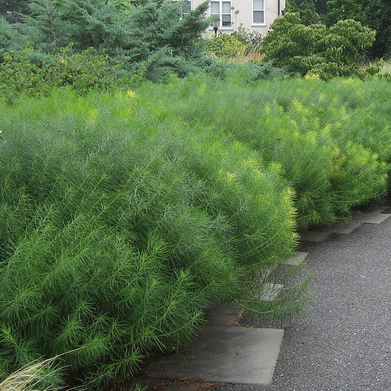 At a height of 24 to 36″, Amsonia hubrichtii looks best as a backdrop for shorter perennials. Its designation as the Perennial Plant of the Year for 2011 indicates that it’s not only attractive, but also adaptable and easy to grow in a variety of garden situations. The tall stems sport feathery foliage and are topped in late spring or early summer by pale blue, star-shaped flowers. In fall, the foliage turns a brilliant yellow. The plant prefers full sun to part shade and moist, rich soil. Cut stems back by about a third after flowering to prevent flopping, a common occurrence if planted in too shady a spot.