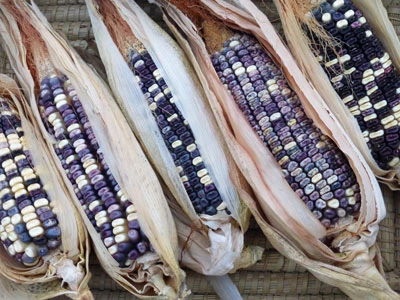(blue and white) 110 days. A beautiful blue and white corn with a red cob. Occasionally there will be an all-blue ear. Some people can see the image of a white eagle in the kernels! 8-10 ft. tall stalks, mostly 2 ears/stalk, 6-7 in. stocky ears. The first variety deposited in the Cherokee Nation Seed Bank. Small (42 g) packet has about 127 seeds.