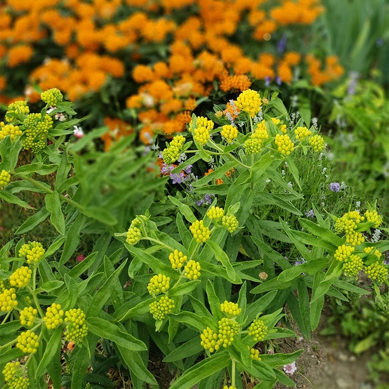 16-24″ tall x 18-24″ wide. ‘Hello Yellow’ provides a unique twist on an old favorite. Butterfly weed is the most well-known member of the native milkweed family and a celebrated monarch host plant. A low-growing milkweed, the flat-topped flowers are beloved by a host of pollinators including hummingbirds, honey bees, native bees, and a diversity of butterflies. A delightful addition to mixed beds and borders, provide adequate drainage and plenty of sunshine. Butterfly weed is drought tolerant once established making a great addition to sustainable landscapes. Plant in mass for a dynamic display. Deadhead plants after the first flush of blooms to encourage continued flowering. Though butterfly weed lacks the milky sap typical of its milkweed relatives, plants are resistant to deer and rabbit browsing. This is one of our most beautiful native wildflowers.Â