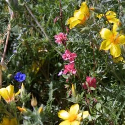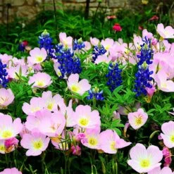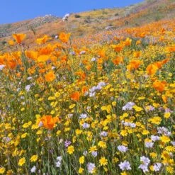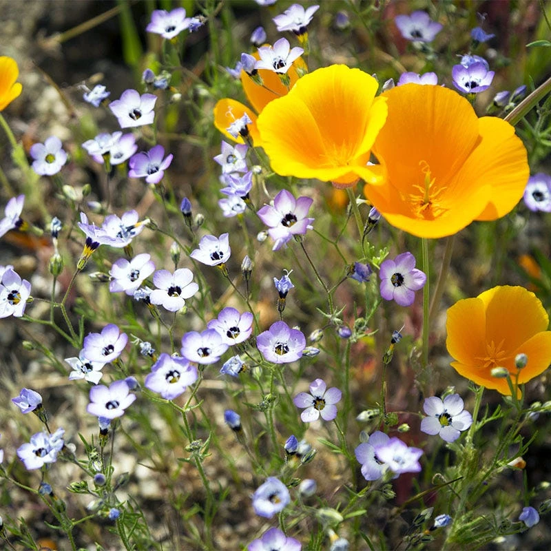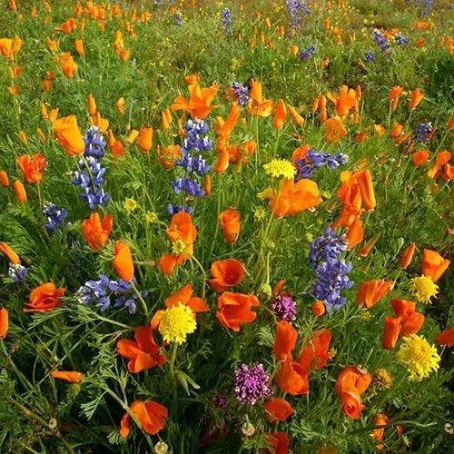 The world-famous wildflowers of the Southwest are brought together to assure a wonderful native meadow from the Pacific coast inland through the deserts. Native annuals in the mix include two species of lupine, Indian Blanket, Desert Marigold, Blazing Star, Farewell to Spring, and more. Perennials include California poppy, of course, and Mexican Gold Poppy too, plus red Mexican Hat and two Evening Primroses, the yellow and the famous pink. Sow as rainy season begins in mild areas; in the mountains, after spring frosts.