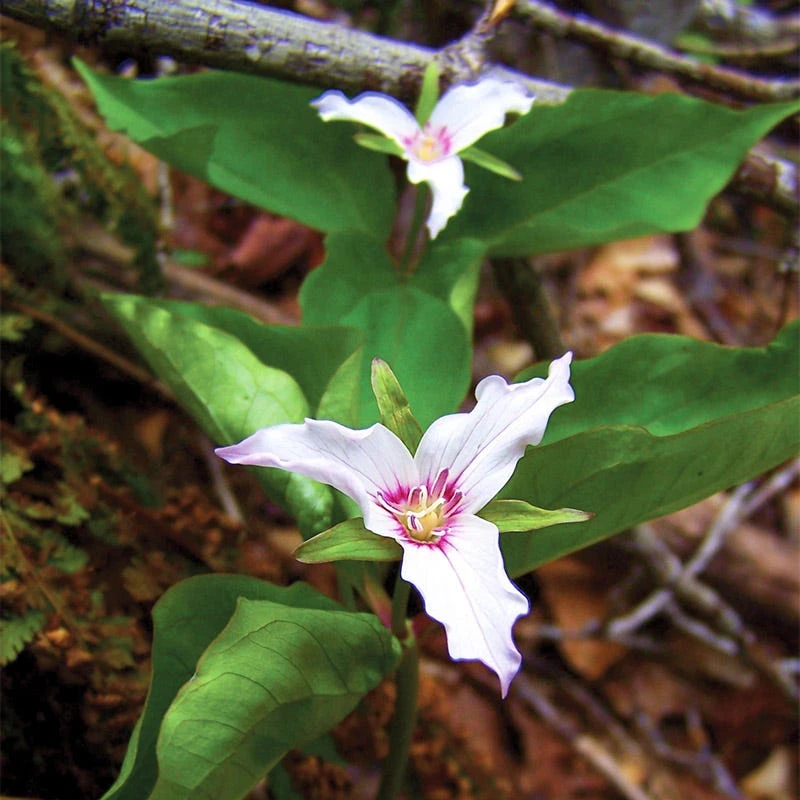 Trillium undulatum, Painted Trillium. Smaller than the Great White or Red, but with one of the most beautiful flowers–white with purplish/red centers. Must have highly acidic soil; common in pine woods. Native to forests from Canada to Georgia.