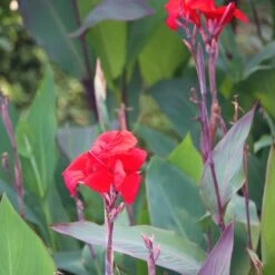 With upright architectural foliage and saturated colors, Cannas have a bold presence that makes them popular in container plantings and a wide range of garden styles. Tall Cannas perform well in containers, bringing height and privacy to terraces and courtyards. Native to semi-tropical and tropical parts of North and South America and the Caribbean, Cannas have been cultivated for centuries and were one of the earliest domesticated plants in the Americas. Easy to grow and widely adaptable, they prefer rich, well-drained soil, plenty of water, and sunny locations. Deadhead plants throughout the summer to keep Cannas blooming. Cannas are hardy in zones 7-10; In cooler regions (zones 2-6), they can be grown as annuals or brought indoors over winter before the first frost.