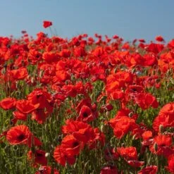 This is the well-loved poppy of Flanders Fields. Also known as Corn Poppy and Flanders Poppy, this species is the symbol of the American Legion. It creates an absolute vision of beauty in full bloom when the lipstick red poppies carpet a whole field, nodding in the breeze. The most famous poem of World War I begins, “In Flanders Fields, the poppies blow, among the crosses row on row.” A great growth of this species after WWI finally ended, attached the lovely red flower to that war and its veterans forever. Today, red poppy is probably the world’s most popular wildflower, and is available in the pure red strain as described here or in the more popular mixed color form. See P. rhoeas, Red Poppy (red, pinks, doubles).