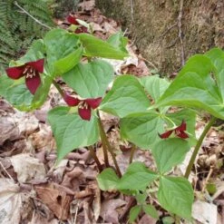 Trillium erectum, Red Trillium. Also called Wake Robin and Stinking Benjamin, the second because of the flowers unpleasant odor, said to be similar to rotting meat. Propagated by flies. Red to purple flowers; plants solitary in acid or alkaline woods. Native to the eastern forests from Canada to Georgia.