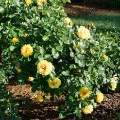 Rise Up™ Ringo® rose is a beautiful mini-climber with double golden-yellow flowers featuring a bright red eye. Very healthy foliage and a very vigorous growth habit. Moderate fragrance. Winner of the Warsaw Rose Trials Photographers Award and the Australian National Bronze Medal.