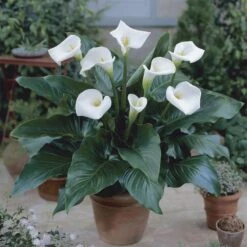 The common white one* is Zantedeschia aethiopica, and like all callas, it’s hardy in the US only in Zones 8 through 10. This makes callas ‘tender bulbs’ in most of the country, and they’ll have to be lifted out of the ground and stored indoors come fall. Zantedeschia aethiopica prefers moist soil and can even thrive when sited along stream banks and water features. Many people grow callas in patio pots, which can be brought in before frost arrives.