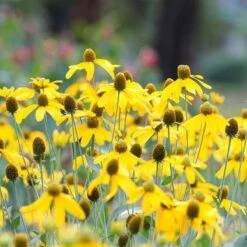 A common sight in the plains states, prairie coneflowers are famous for the tall cone in the center of each bloom. Lemon-yellow flowers; light green foliage. Flower size varies with amount of moisture plant receives. See red version of this species, Mexican Hat, or R. columnaris (red).